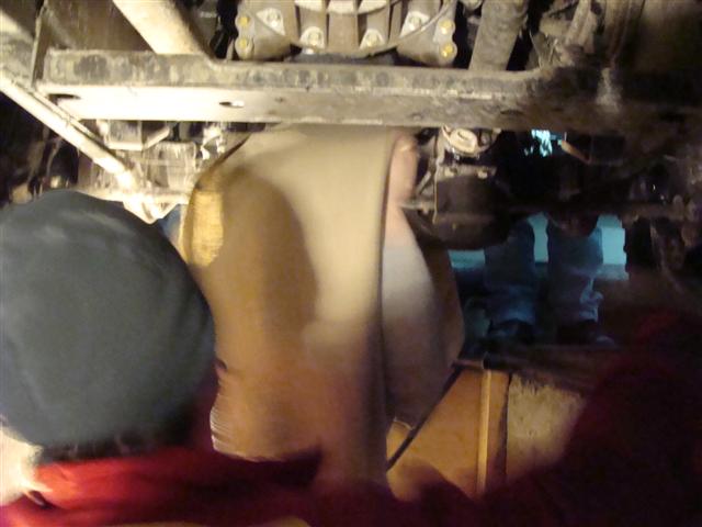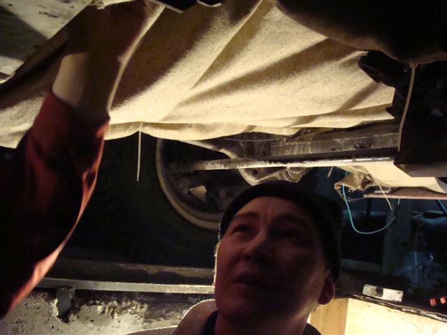 Sort or sacking / blanket that all the vehicles have underneath tied up with bits of wire (hence its quite common to see vehicles dragging it behind them). But it must work as everybody does it!