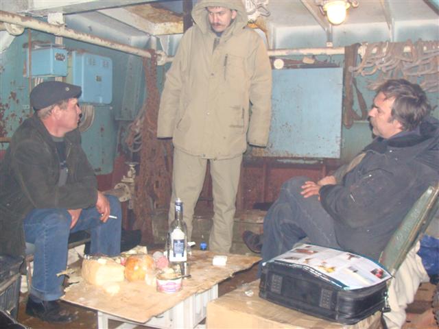 We had to spend the journey in the ship's hold which was freezing. Our companions were telephone engineers who spent the whole journey drinking vodka and could hardly climb the ladder to get out when we reached Uelen!