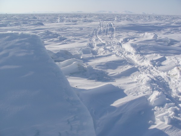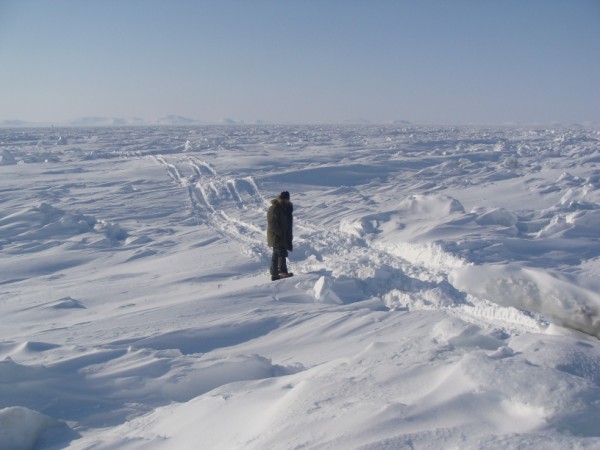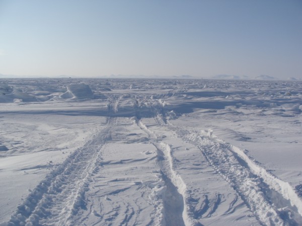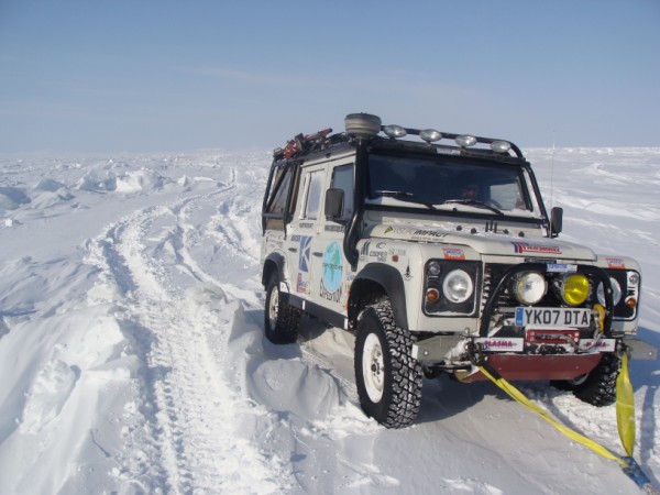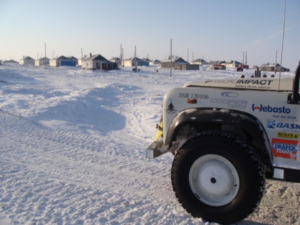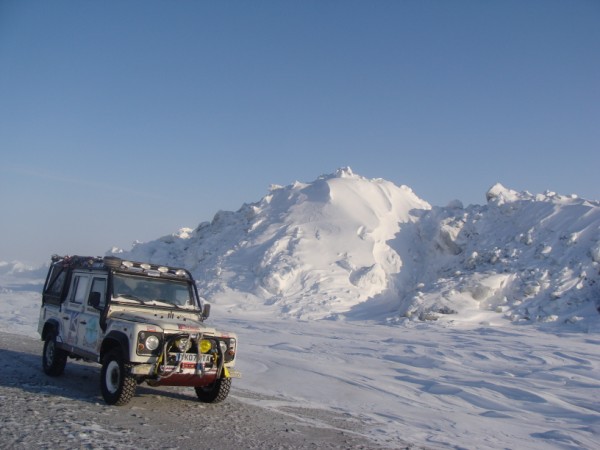 We have done about 100km again today - mainly being towed by the tank. We managed to cross the sea inlet just before the sand spit leading to Neshkan which was quite horrendous with the Land Rover simply being towed over huge lumps of ice and snow. It is surviving though and that "shortcut" did save us about 300km. The Land Rover can drive on the sand spits ok - its the valleys inland full of very deep snow and the frozen sea it can't cope with.