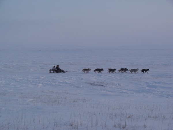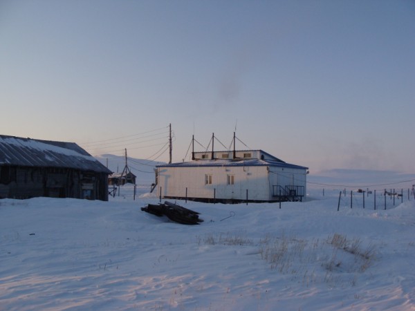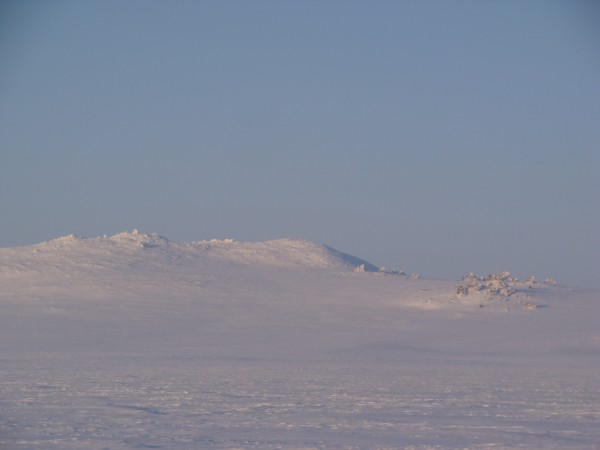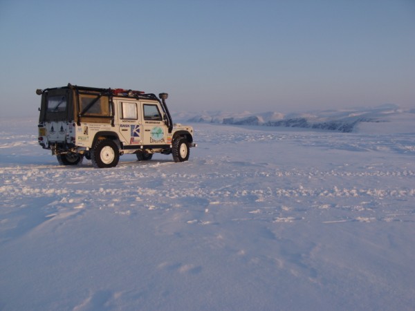 We did about 20km when we had to cross a valley which had 4ft snow in the bottom. The Land Rover got dragged onto its side and we were stuck. The tank is also finding it hard work and sometimes is only driving on one track. After digging ourselves out we continued on until the clutch on the tank went. While they were fixing that I went for a walk and saw some Polar bear prints so made a hasty retreat back to the vehicles. When we set off again we saw it not far away. We did another 35km in total making the day's total 55 - not bad to say how rough it was. It has been decided that as Oleg doesn't actually know the way that he would unhitch us this evening and return to Enurmino for more diesel and a guide.