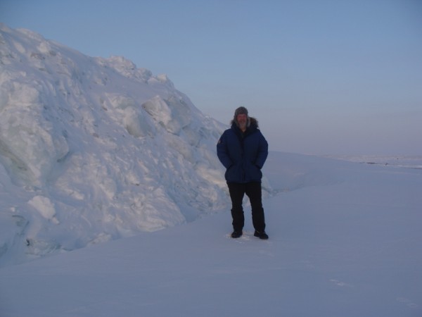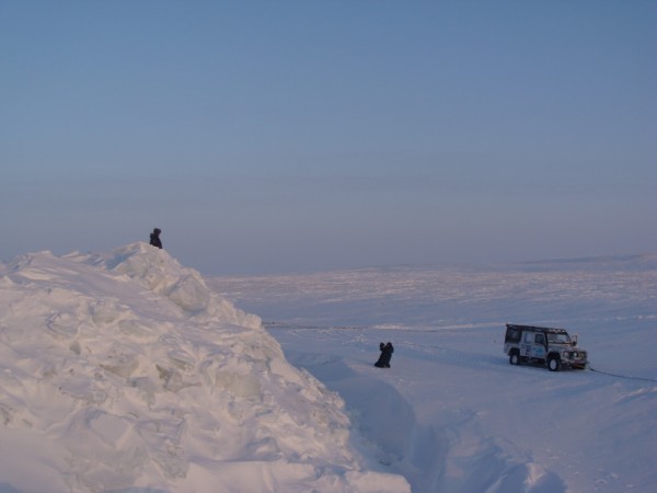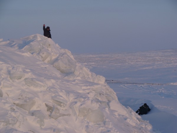 Below are pictures of a pressure ridge. Its these that are causing the problems as we can't go over them so have to find a way round. Only a few years ago the sea used to freeze flat but now there is no pack ice and instead there is open water out to sea which results in these pressure ridges.